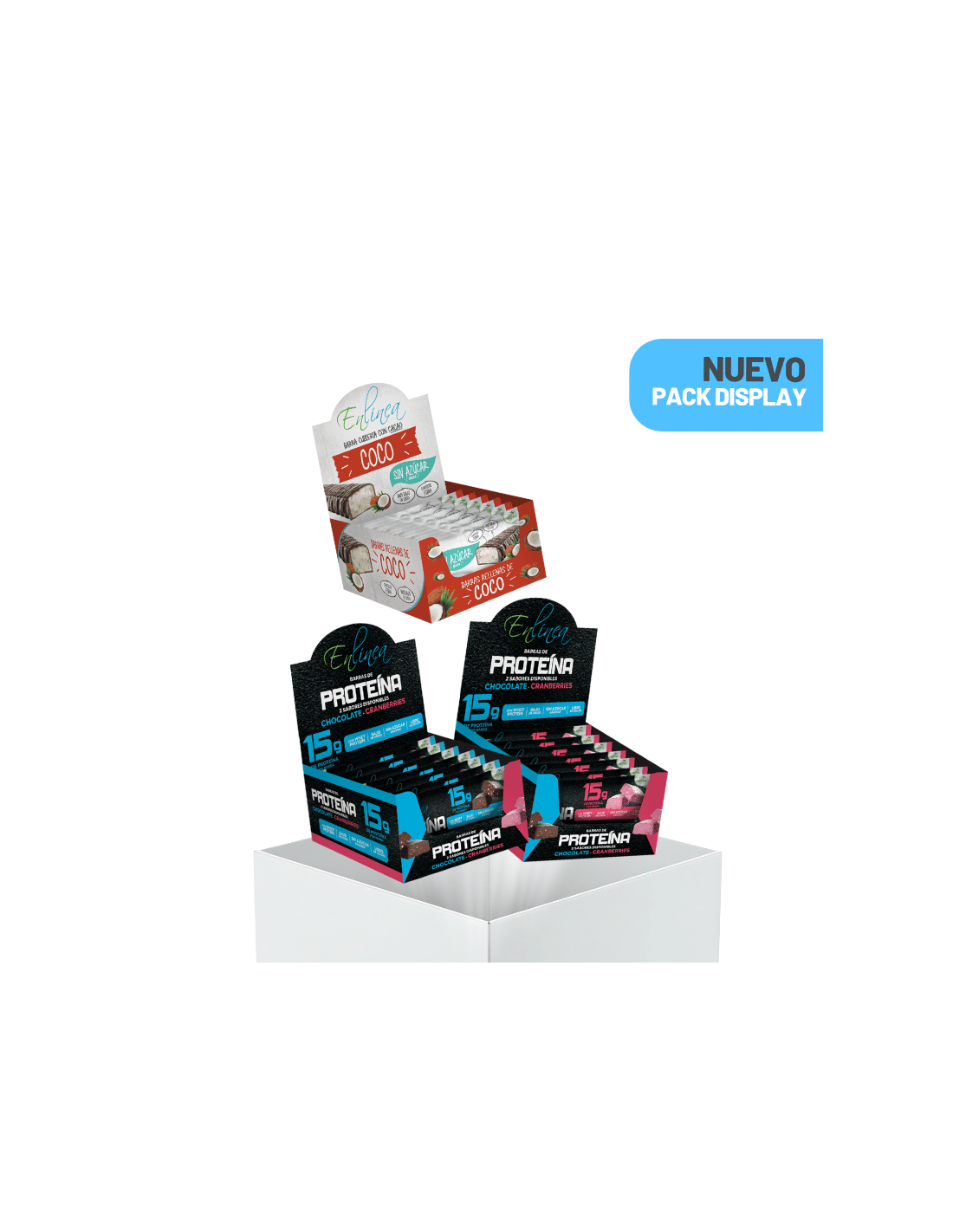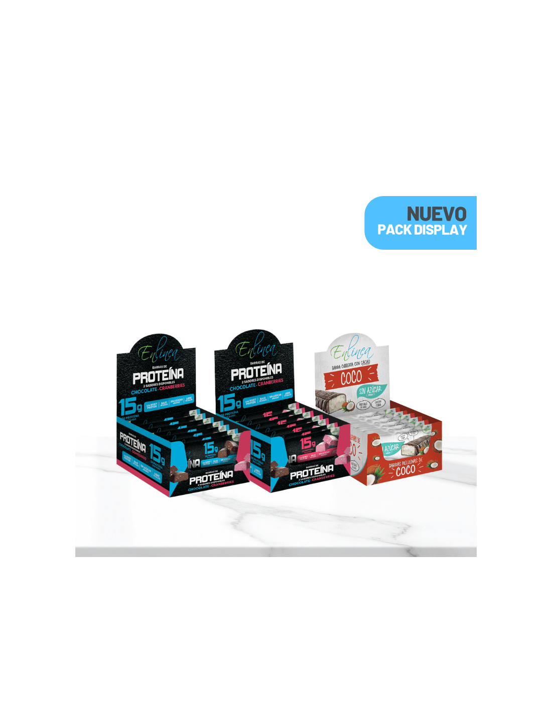 Incluye 3 display: chocolate con proteína, proteína con cranberries y chocolate relleno de coco, todos sin azúcar, pero llenos de sabor.